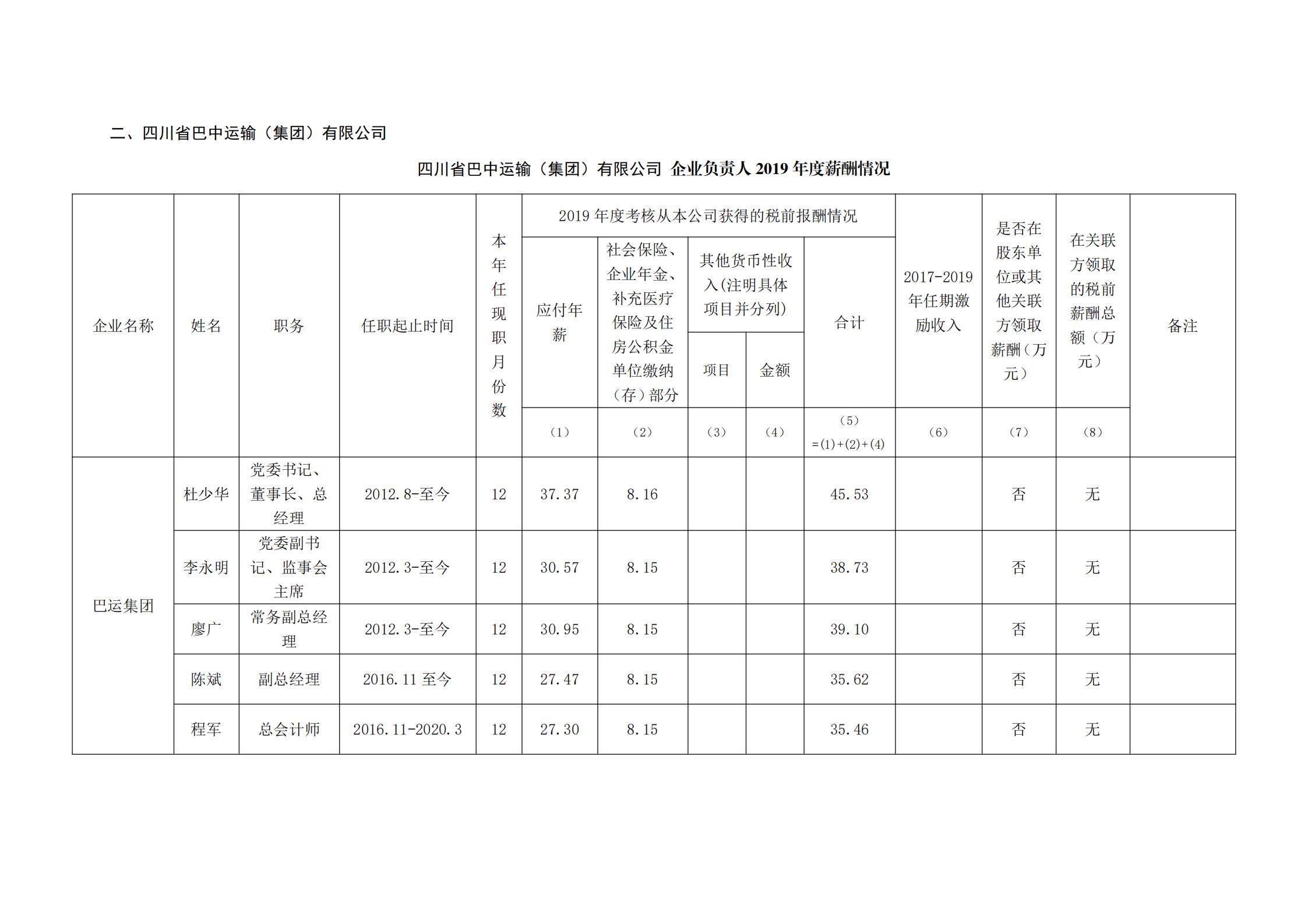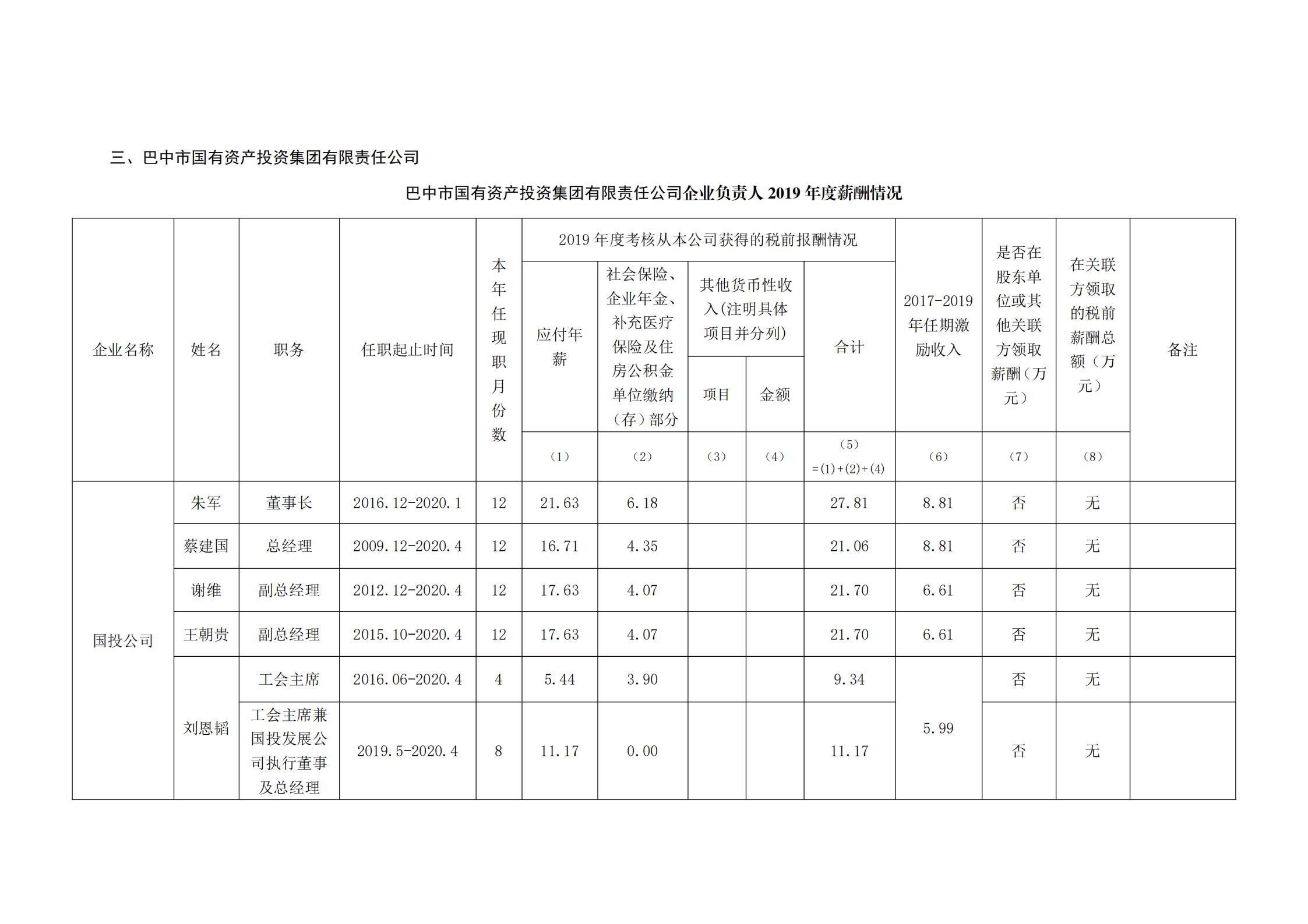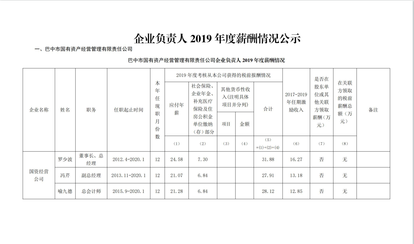 企业负责人2019年度薪酬情况公示